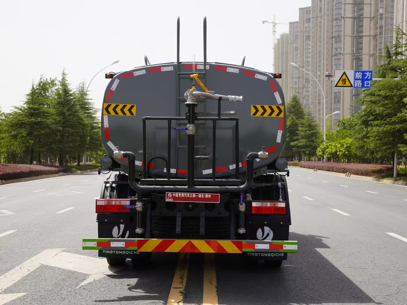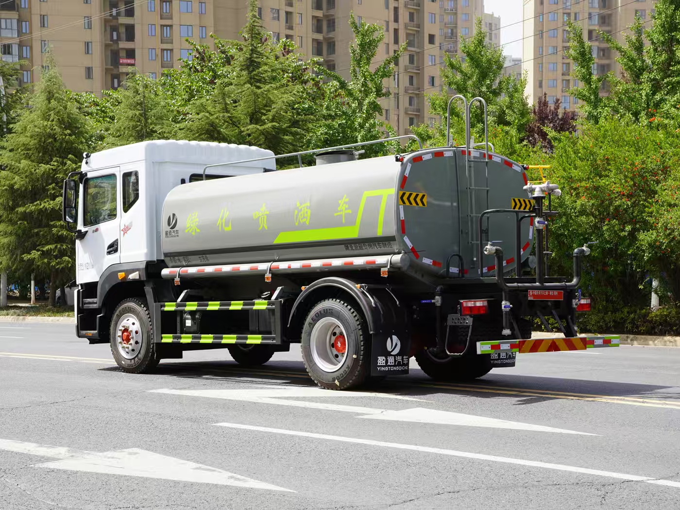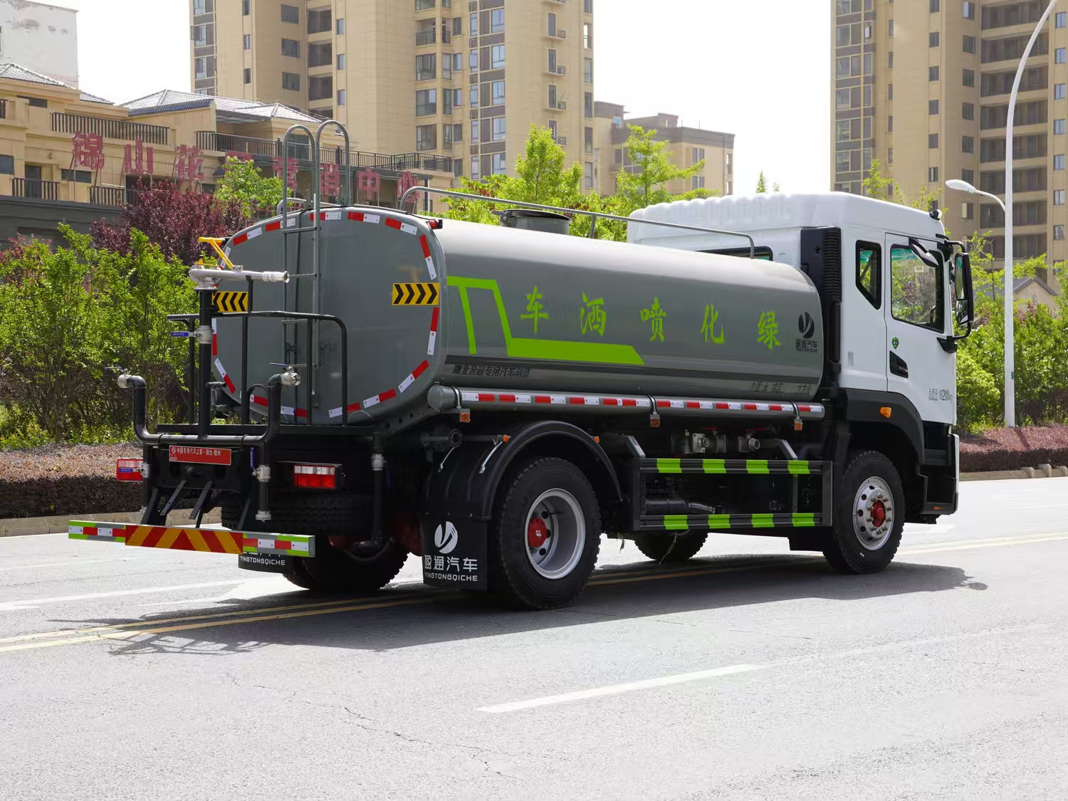 改裝配置:罐體用4MM碳鋼板製作,罐內隔板具有防波作用,以減低汽車行駛時罐體液體的衝擊。整車帶一個專用灑水泵(垂直最大吸程6米),灑水寬度14米,射程28米。多功能灑水車配備2個前衝(噴)(能將路麵泥巴、塵土、垃圾衝幹淨);2個後灑(能均勻地將水灑在路麵,一次灑水寬度14米)、2個側噴(花灑)(能均勻地將路旁綠化帶澆灌)、帶1個後工作平台,平台上安裝1個綠化灑水高炮(灑水炮可全方位旋轉,可連續調成直衝狀、大雨、小雨、毛毛雨,霧狀可調節衝洗高大樹木),引水時間<5min,流量90m3/h。帶1個消防接頭,帶1個自流閥,1個過濾裝置、人性化爬梯及側防護欄,安裝灑水音樂喇叭。