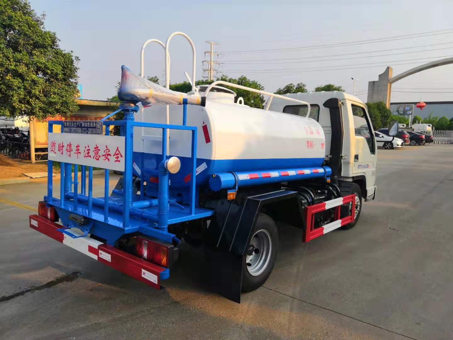 改裝配置:罐體用4MM碳鋼板製作,罐內隔板具有防波作用,以減低汽車行駛時罐體液體的衝擊。整車帶一個專用灑水泵(垂直最大吸程6米),灑水寬度14米,射程28米。多功能灑水車配備2個前衝(噴)(能將路麵泥巴、塵土、垃圾衝幹淨);2個後灑(能均勻地將水灑在路麵,一次灑水寬度14米)、2個側噴(花灑)(能均勻地將路旁綠化帶澆灌)、帶1個後工作平台,平台上安裝1個綠化灑水高炮(灑水炮可全方位旋轉,可連續調成直衝狀、大雨、小雨、毛毛雨,霧狀可調節衝洗高大樹木),引水時間<5min,流量90m3/h。帶1個消防接頭,帶1個自流閥,1個過濾裝置、人性化爬梯及側防護欄,安裝灑水音樂喇叭。