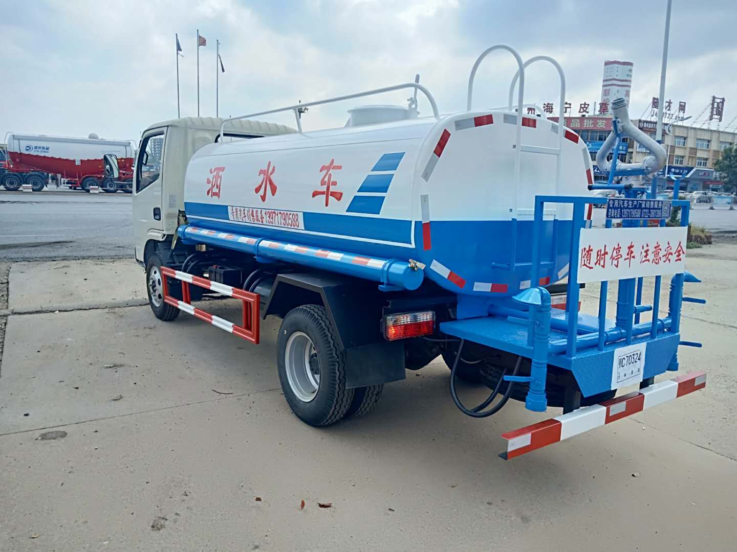 東風5噸灑水車,駕駛室采用東風福瑞卡帶翻轉駕駛室,發動機一汽錫柴87馬力國五柴油發動機,5檔變速箱,700-16尼龍胎,帶方向助力,ABS,氣刹,帶暖風不帶製冷。該車有免征公告,環保已達標。采用武鋼4mm優you質zhi碳tan鋼gang板ban一yi次ci卷juan壓ya成cheng型xing,完wan全quan做zuo到dao無wu縫feng成cheng型xing。罐guan體ti內nei設she多duo道dao防fang波bo隔ge板ban,采cai用yong高gao壓ya氣qi體ti試shi漏lou檢jian測ce,使shi罐guan體ti具ju有you強qiang度du高gao,重zhong心xin穩wen,車che輛liang運yun載zai安an全quan平ping穩wen。罐guan體ti及ji保bao險xian杠gang貼tie紅hong白bai色se反fan光guang條tiao,罐guan體ti兩liang側ce噴pen“灑水車”字樣(可按客戶指定要求噴繪字樣),罐體顏色可選擇上白下藍或銀灰銀藍。