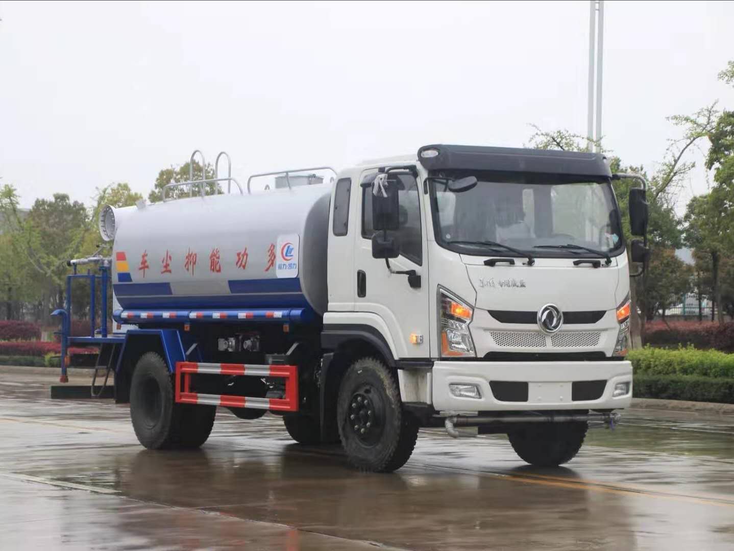 改裝配置:罐體用4MM碳鋼板製作,罐內隔板具有防波作用,以減低汽車行駛時罐體液體的衝擊。整車帶一個專用灑水泵(垂直最大吸程6米),灑水寬度14米,射程28米。多功能灑水車配備2個前衝(噴)(能將路麵泥巴、塵土、垃圾衝幹淨);2個後灑(能均勻地將水灑在路麵,一次灑水寬度14米)、2個側噴(花灑)(能均勻地將路旁綠化帶澆灌)、帶1個後工作平台,平台上安裝1個綠化灑水高炮(灑水炮可全方位旋轉,可連續調成直衝狀、大雨、小雨、毛毛雨,霧狀可調節衝洗高大樹木),引水時間<5min,流量90m3/h。帶1個消防接頭,帶1個自流閥,1個過濾裝置、人性化爬梯及側防護欄,安裝灑水音樂喇叭。