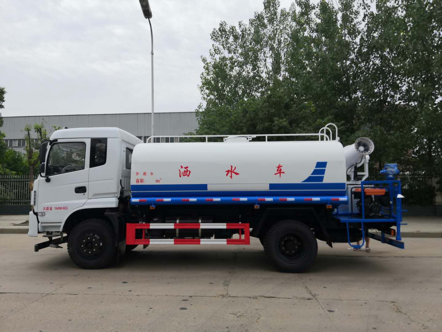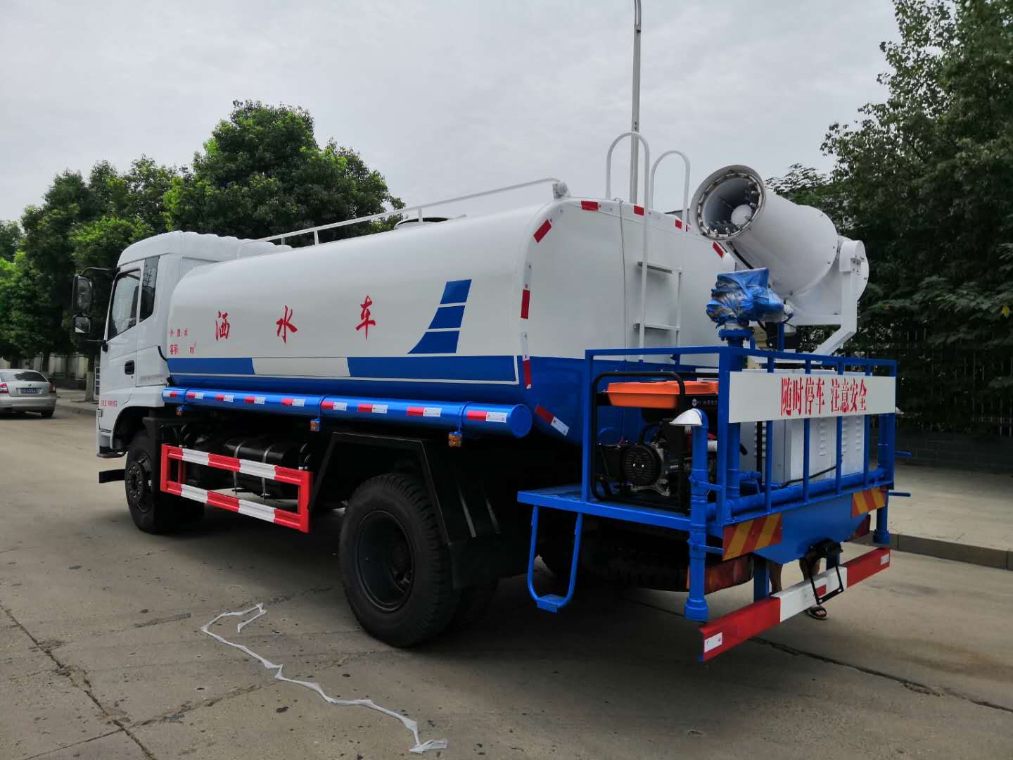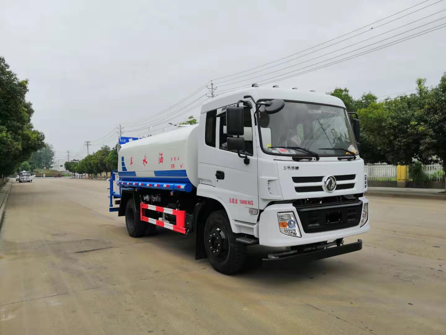 改裝配置:罐體用4MM碳鋼板製作,罐內隔板具有防波作用,以減低汽車行駛時罐體液體的衝擊。整車帶一個專用灑水泵(垂直最大吸程6米),灑水寬度14米,射程28米。多功能灑水車配備2個前衝(噴)(能將路麵泥巴、塵土、垃圾衝幹淨);2個後灑(能均勻地將水灑在路麵,一次灑水寬度14米)、2個側噴(花灑)(能均勻地將路旁綠化帶澆灌)、帶1個後工作平台,平台上安裝1個綠化灑水高炮(灑水炮可全方位旋轉,可連續調成直衝狀、大雨、小雨、毛毛雨,霧狀可調節衝洗高大樹木),引水時間<5min,流量90m3/h。帶1個消防接頭,帶1個自流閥,1個過濾裝置、人性化爬梯及側防護欄,安裝灑水音樂喇叭。