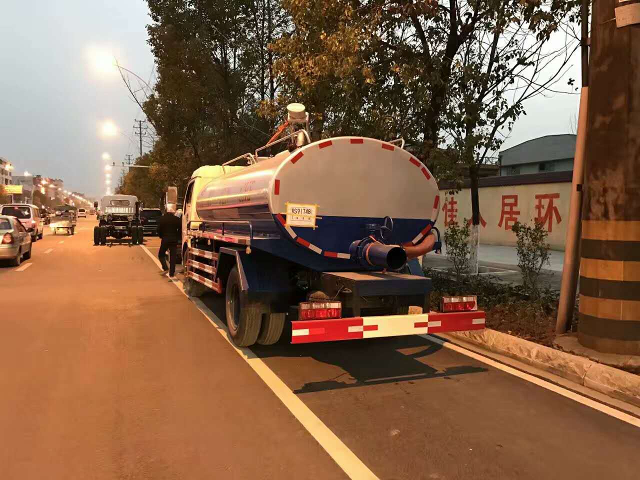 改裝配置:罐體容積9立方,罐體采用碳鋼板製作,耐用不易變形。罐體顏色上白下藍或銀灰銀藍,罐體形狀是橢圓形,配杭州威龍真空吸糞泵、可泵進泵出,抽滿汙(糞)罐體時間≤5min,垂直吸程:6m。帶視糞窗、1根6米長吸糞管,罐體後部帶有自流口1個,罐體旁邊裝有洗手裝置,罐體頂部有吸糞大架可以360°旋轉,帶吊杆及座,帶油水分離器、防溢閥(可防止糞便、汙水因吸滿倒灌至真空泵係統)。